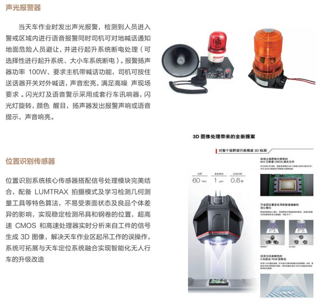 5、位置識(shí)別系統(tǒng):采用定位及位置識(shí)別最新技術(shù),通過圖像識(shí)別傳感器,識(shí)別鋼卷和吊具的位置,進(jìn)行計(jì)算和分析判斷吊具與鋼卷具備吊掛和起吊條件,進(jìn)行語音提示,系統(tǒng)具有自動(dòng)識(shí)別跟蹤鋼卷與吊具的距離,操作工實(shí)時(shí)掌握清晰的位置及畫面信息,準(zhǔn)確無誤的操作,與天車定位系統(tǒng)拓展能達(dá)到自動(dòng)起吊,最終實(shí)現(xiàn)智能化、無人化行車的升級(jí)改造。該系統(tǒng)能極大的減少操作人員的誤操作,給生產(chǎn)及安全提供有力保障,提高生產(chǎn)效率及設(shè)備安全性。